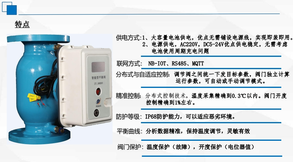 ?、庵悄茈妱诱{(diào)節(jié)閥具備24v交直流供電,支持RS485通訊和模擬量信號,同時支持低功耗藍(lán)牙組網(wǎng)無線通訊和調(diào)試功能,是熱力站內(nèi)精調(diào)節(jié)控制器,支持兩路壓力、兩路溫度監(jiān)測,支持自動溫差、溫度調(diào)節(jié)功能,具備承受較大的壓力差,工作時振動較小,調(diào)節(jié)性能好,使用壽命長特性,廣泛應(yīng)用與城市集中供熱自動控制系統(tǒng)中,是智慧熱力站整體解決方案重要組成部分。通過與云平臺、AI算法調(diào)控、嵌入式技術(shù)等深度融合,實現(xiàn)對熱力站一次、二次管網(wǎng)熱量、流量及溫度高效智能化調(diào)控。